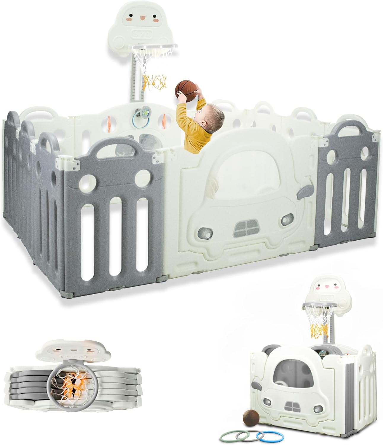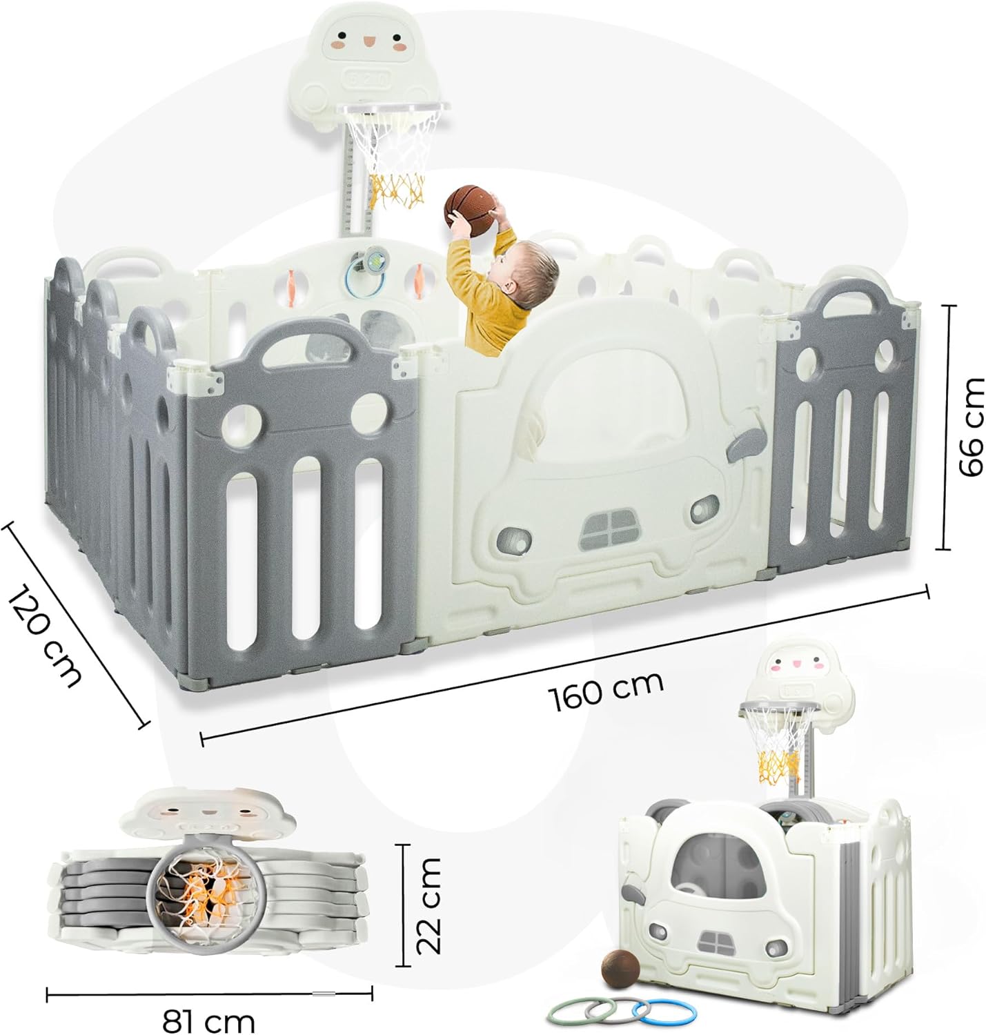 Haute qualité et sécurité : le pack pour enfants est fabriqué et testé selon la norme européenne EN 71, avec des matériaux sans BPA, non toxiques et respectueux de l’environnement que les enfants peuvent utiliser en toute sécurité. La porte du parc a été réalisée grâce aux idées apportées par les parents et dispose d’une fermeture basculante avec serrure de sécurité. Complet Comprend un panier, un ballon de basket et des cerceaux de jeu